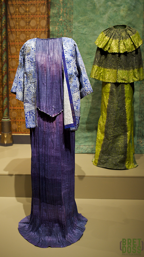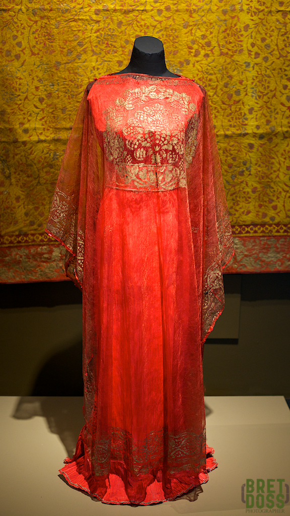 Mariano Fortuny (1871-1949) fascinates me: he was (among other things) a lighting designer (for stage productions), a photographer, and a fashion designer. Right away, I imagined the interesting conversations we could have had! The exhibit included many life-size photographs that he himself had made of models, including his wife Henrietta (a dress maker), wearing his designs. He developed a by-hand pleating process that is unrivaled and the fine pleats he formed are still crisp today. His designs were worn by Lauren Bacall, Mrs. Conde’ Nast, and Isadora Duncan.