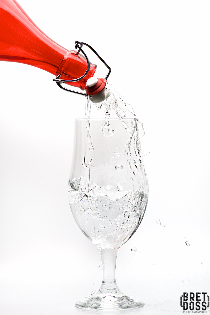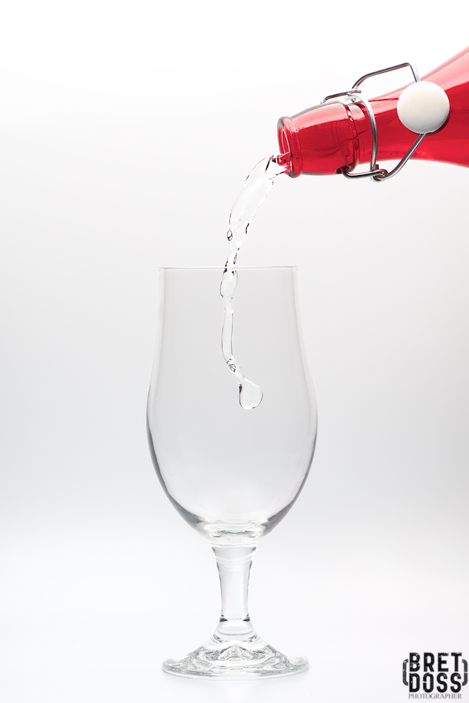 The ‘pour shot’ is practically a rite of passage for every commercial photographer. I decided it was time. There are any number of ways to approach a pour shot, and most often they involve a colorful liquid. I wanted to test lighting and composition as well as the shooting technique (more on that in a bit), and used water so as not to waste the colorful beverages. I quickly found that I liked the water shots better.