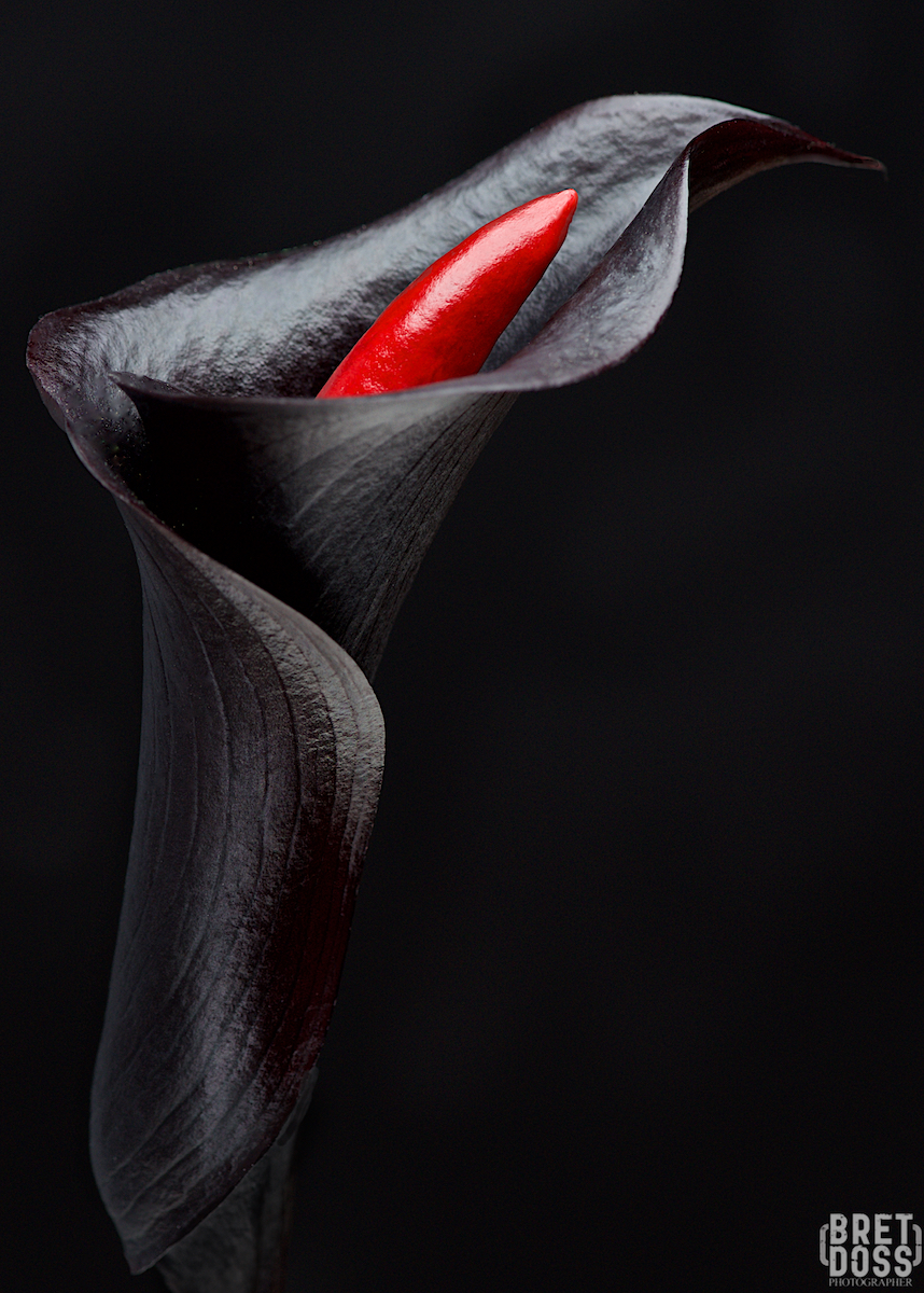 For this, I had a concept in mind beyond a ‘straightforward’ image of a lily. I was surprised to find black calla lilies — I didn’t know they even existed. Photographing black items on black backgrounds is a fun (sometimes) challenge, and the concept-imagining got under way. It took a few days for an idea to gel, but it finally did and I couldn’t wait to make the images.