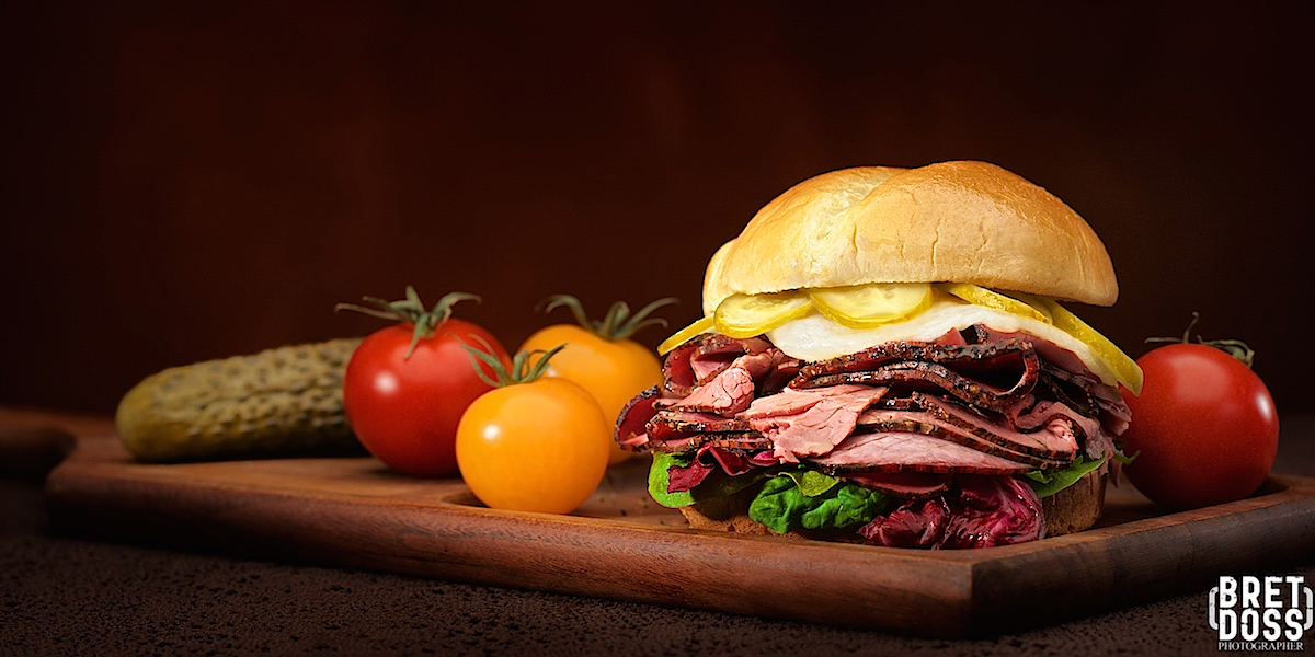 So I worked with the pastrami sandwich, positions of lights and camera, exposure settings and a representative styling approach to get everything ready. Lots and lots of test shots later, I ate the sandwich as I retouched the image (presented below for reference).